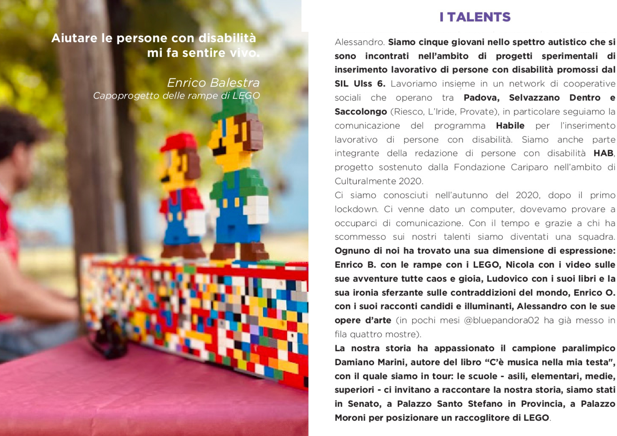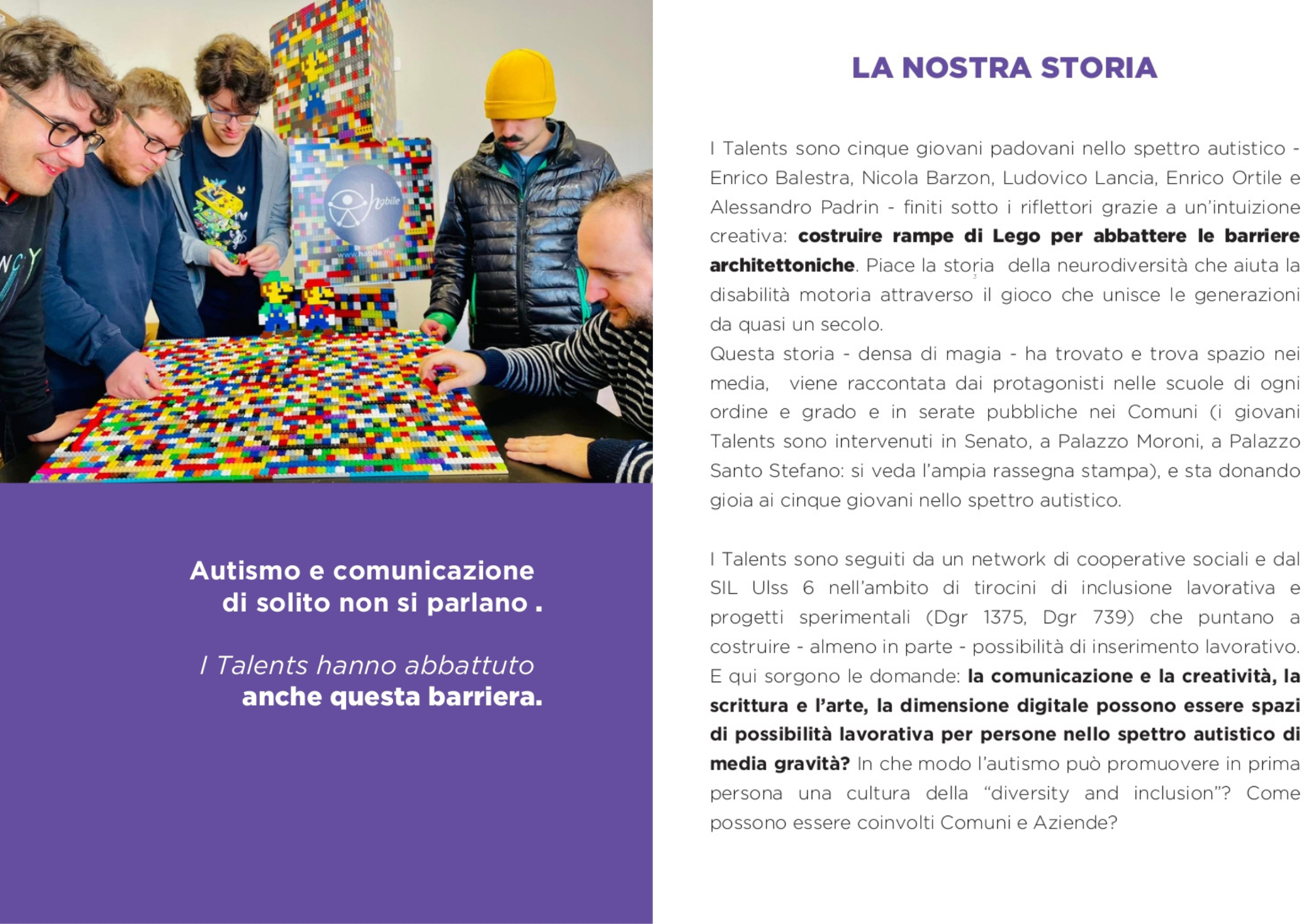 Nasce dall’incontro di cinque ragazzi con spettro autistico che vivono nella zona di Padova che, all’interno di alcuni contesti lavorativi sperimentali, sviluppano l’idea di promuovere l’inclusione attraverso il gioco dei LEGO.