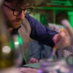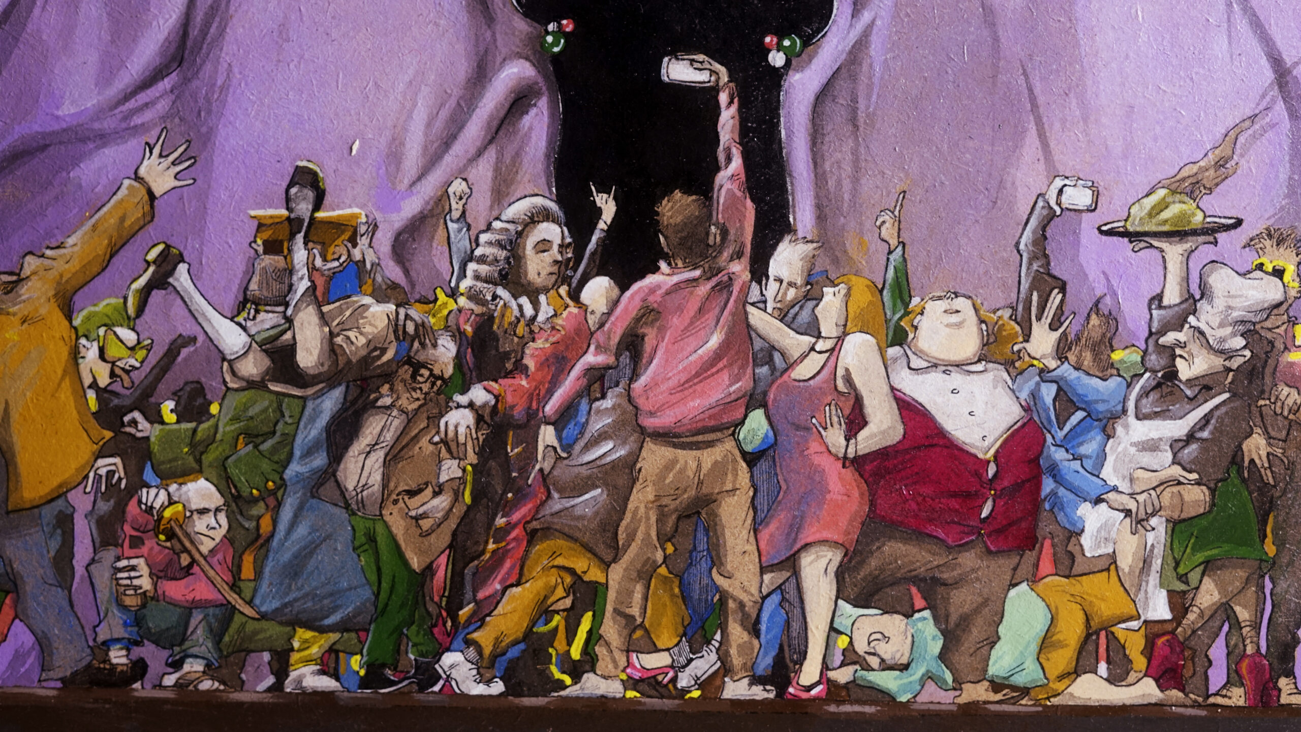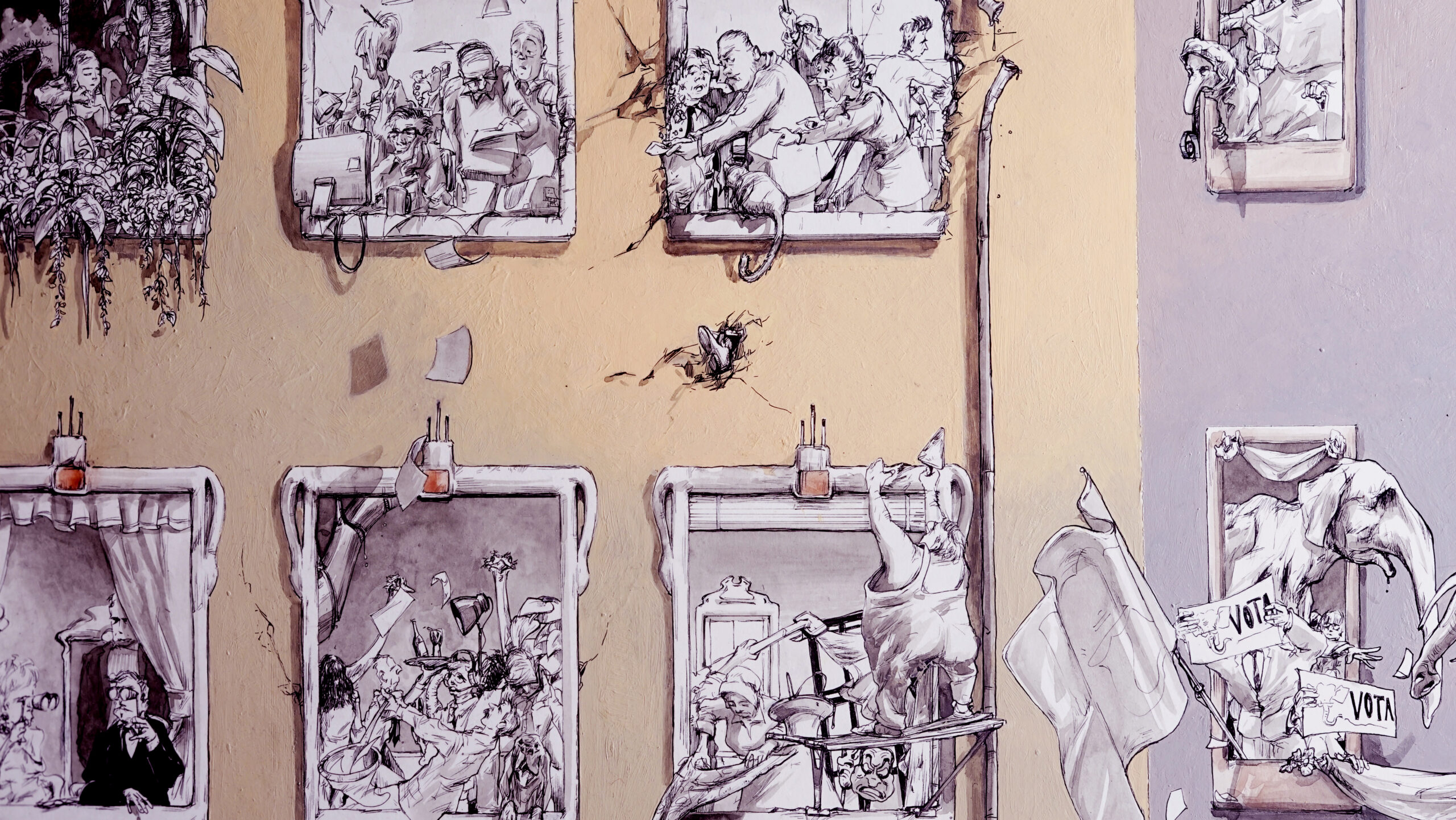 Per quanto riguarda le tecniche, man mano che la mia ricerca prendeva piede ho capito, in base al soggetto, quali materiali privilegiare; quali toni di colore e quali intensità. L’inchiostro, distribuito da trattopen molto sottili (non più di 0,2 mm), caratterizzano ogni aspetto dell’ossatura di questi lavori. Un tratto discreto ma sempre deciso e affidabile, oltre alla facile simbiosi con ogni tono di colore e alla sua buona reazione alle vernici finali. Poi in certi casi l’ombreggiatura ad acquarello mi ha assistito nella tridimensionalità di alcune scene o di singoli personaggi. A chiudere, l’acrilico, spesso usato in campiture dense e piatte, per creare pareti o spazi di pieno colore su cui far stagliare le moltitudini dei “Tanti”. Un’architettura di materiali pulviscolari e variegati che si sono trovati a coesistere per rispondere all’esigenza armonica che avevo nella mente e negli occhi. Un po’ come l’architettura pulviscolare e variegata di una folla o di una massa di oggetti che trova nel fondo dell’occhio e dello spirito un suo misterioso equilibrio.