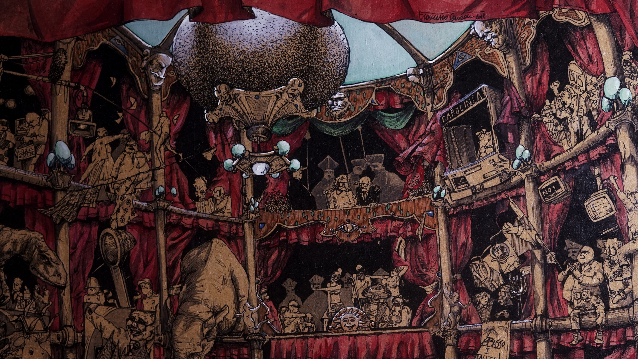 - VIENE GIU’ IL TEATRO. 2018. Inchiostro, acquerello e acrilico su legno. 50 x 50 cm.